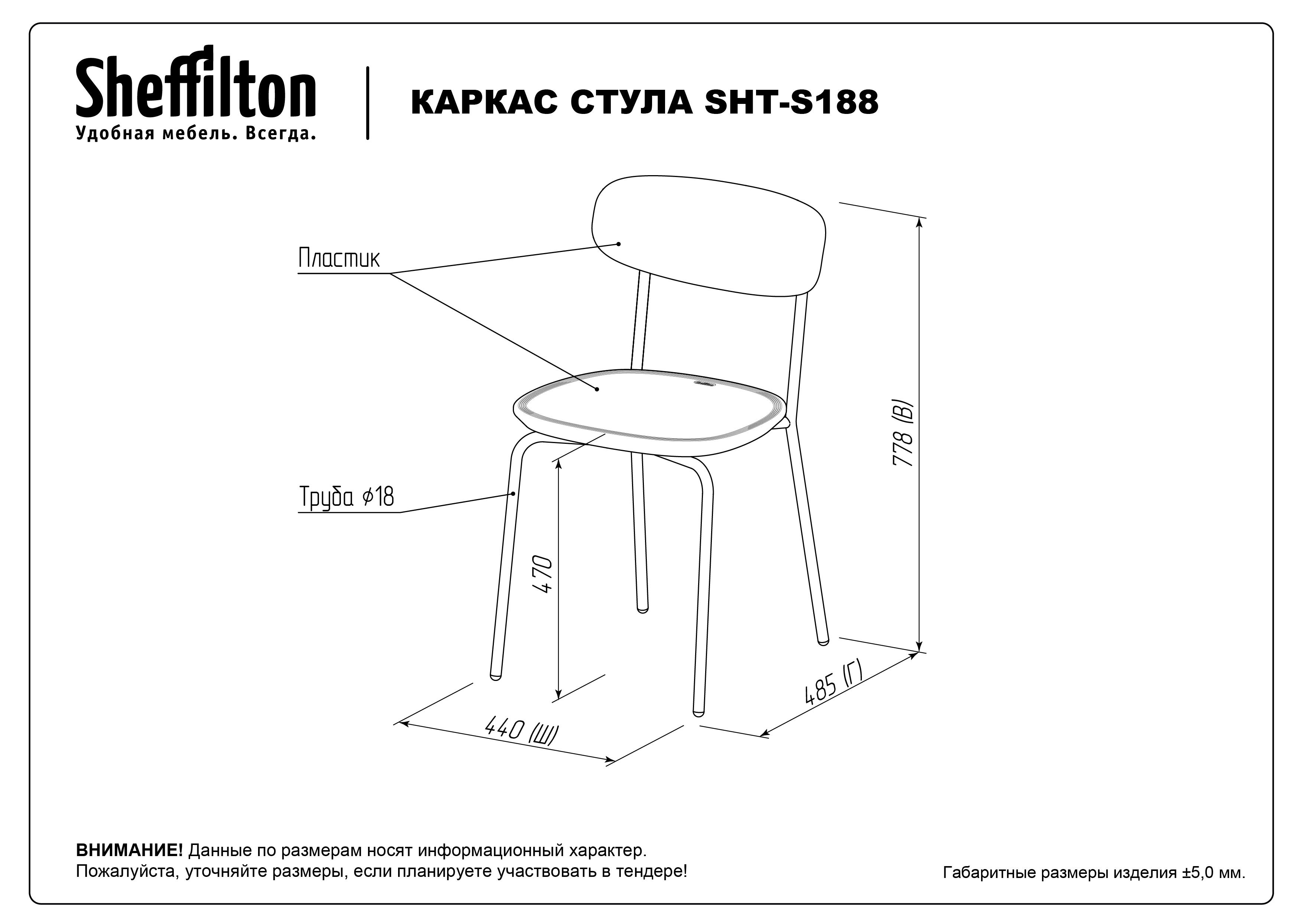 Каркасы стульев разработаны и протестированы для использования исключительно с сиденьями ТМ Sheffilton. При использовании с сиденьями других производителей компания не несёт ответственности и гарантийных обязательств.