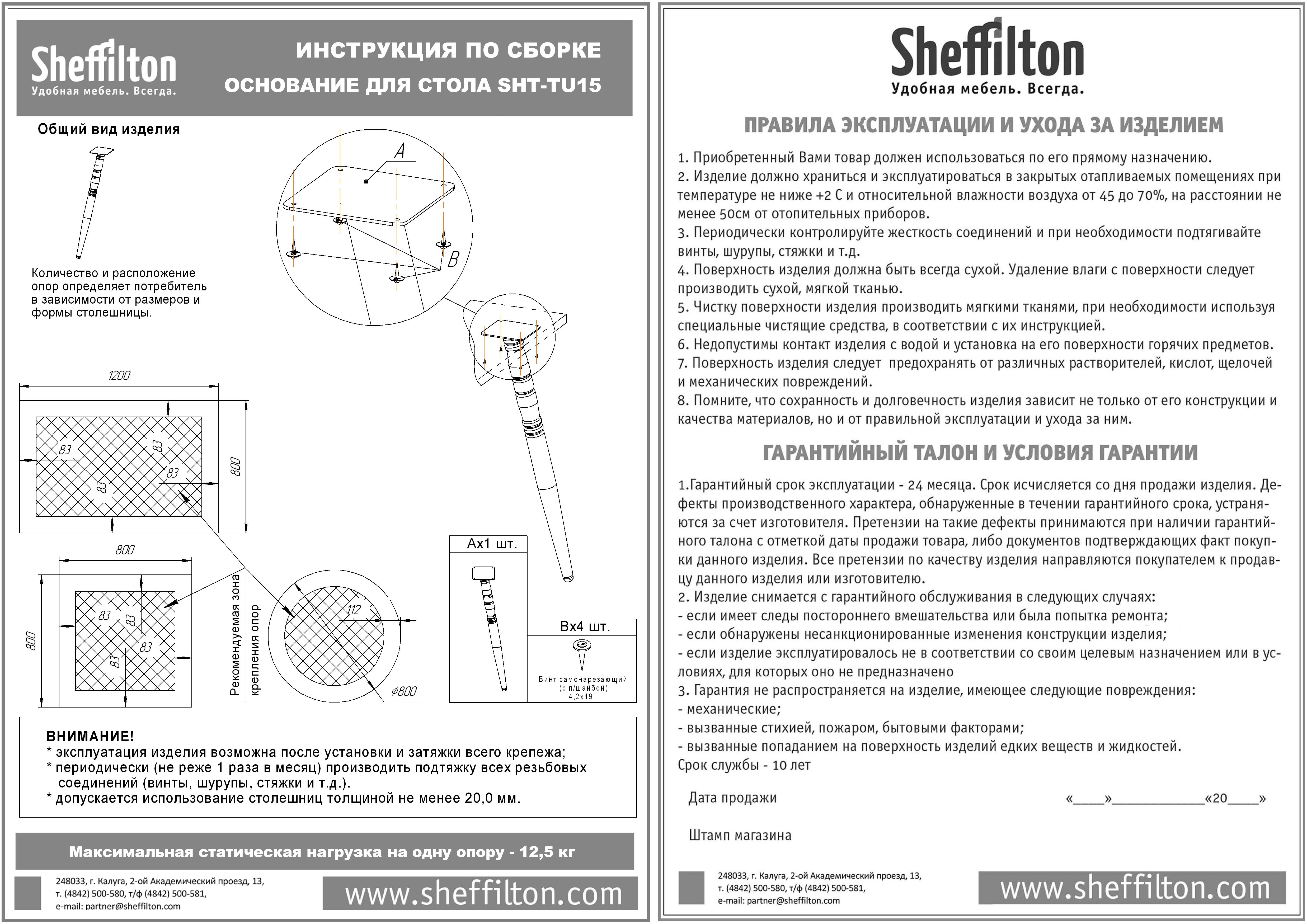 Максимальная нагрузка на одну опору 12,5 кг.