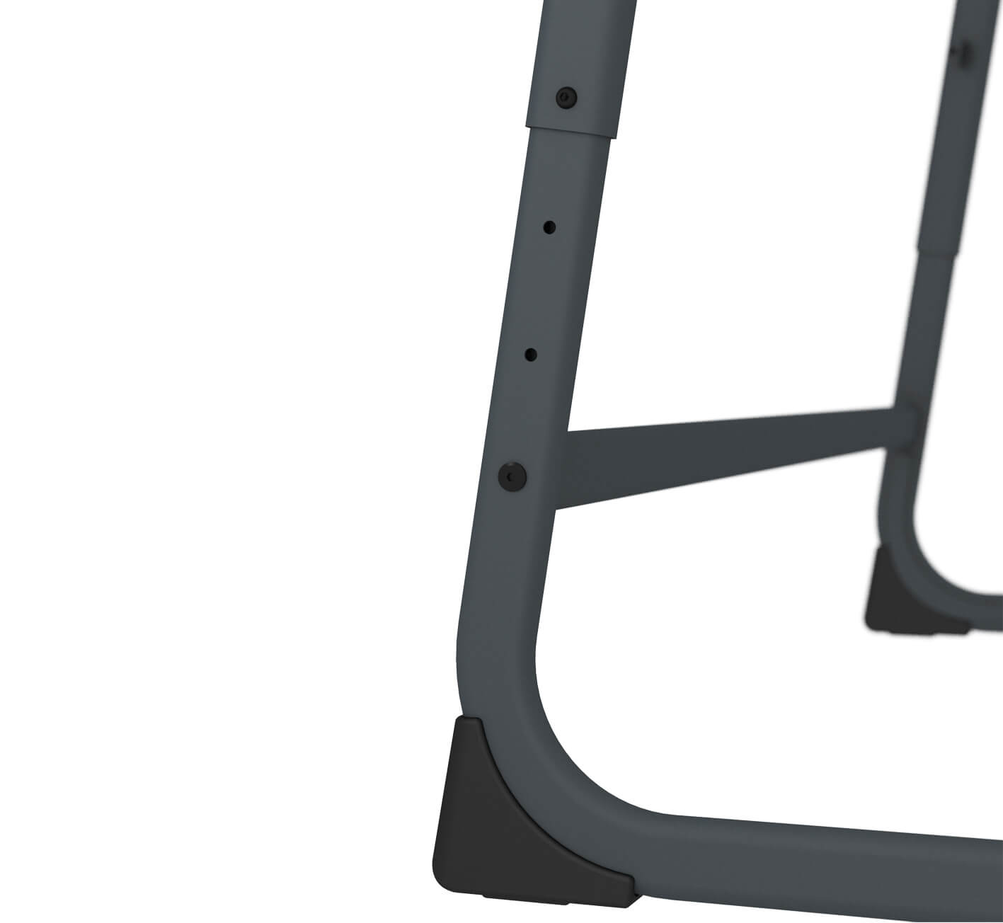 Столешница не имеет острых углов — все углы аккуратно закруглены, что делает ее травмобезопасной. Специальные заглушки каркаса предотвращают царапины на полу во время эксплуатации стула и травмобезопасны.
