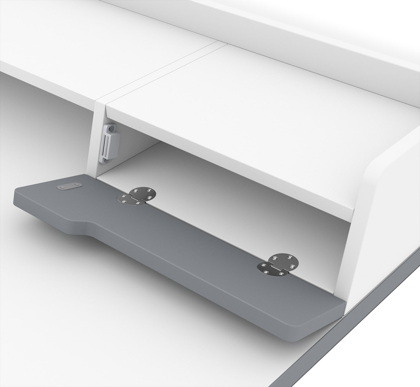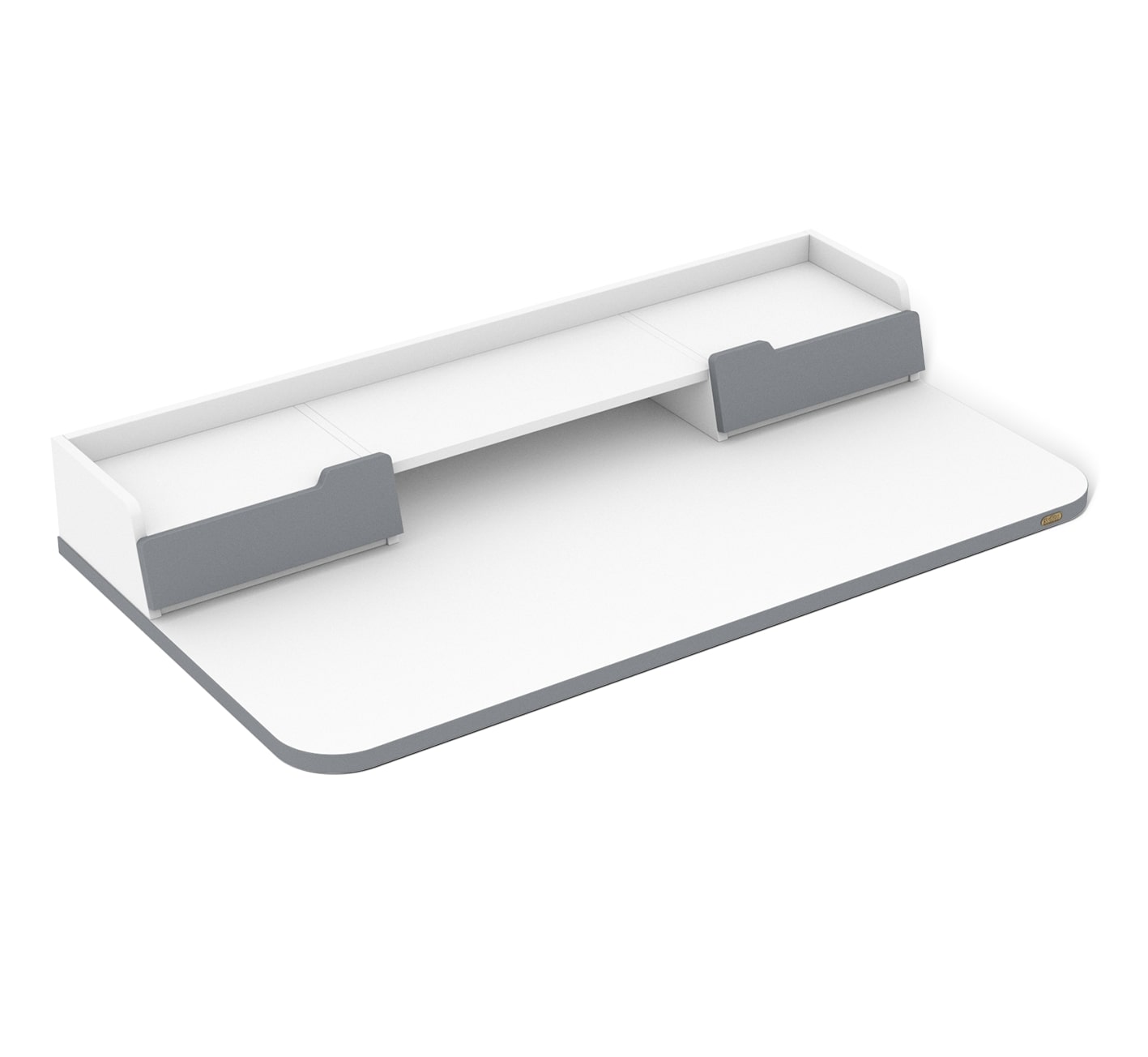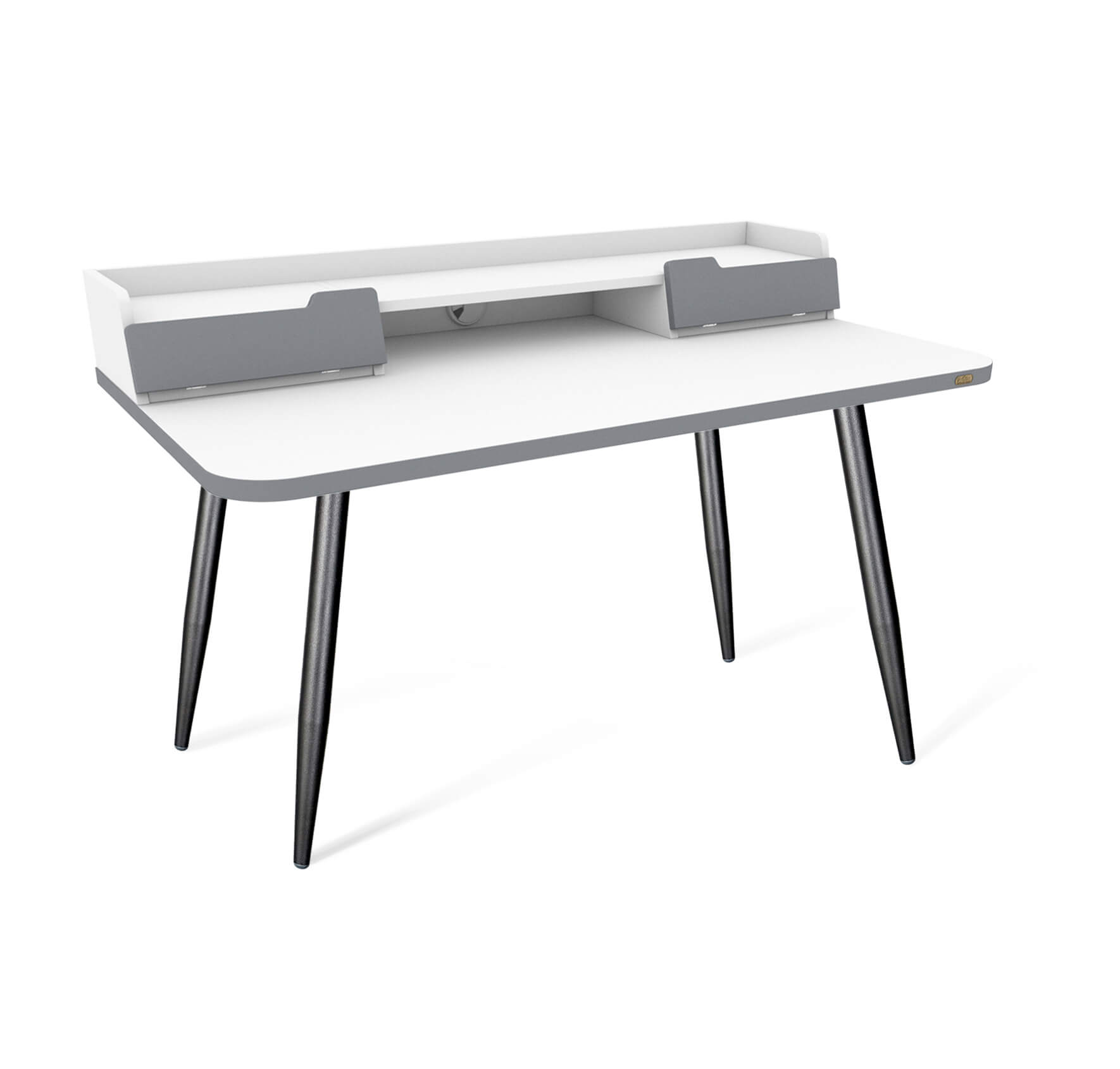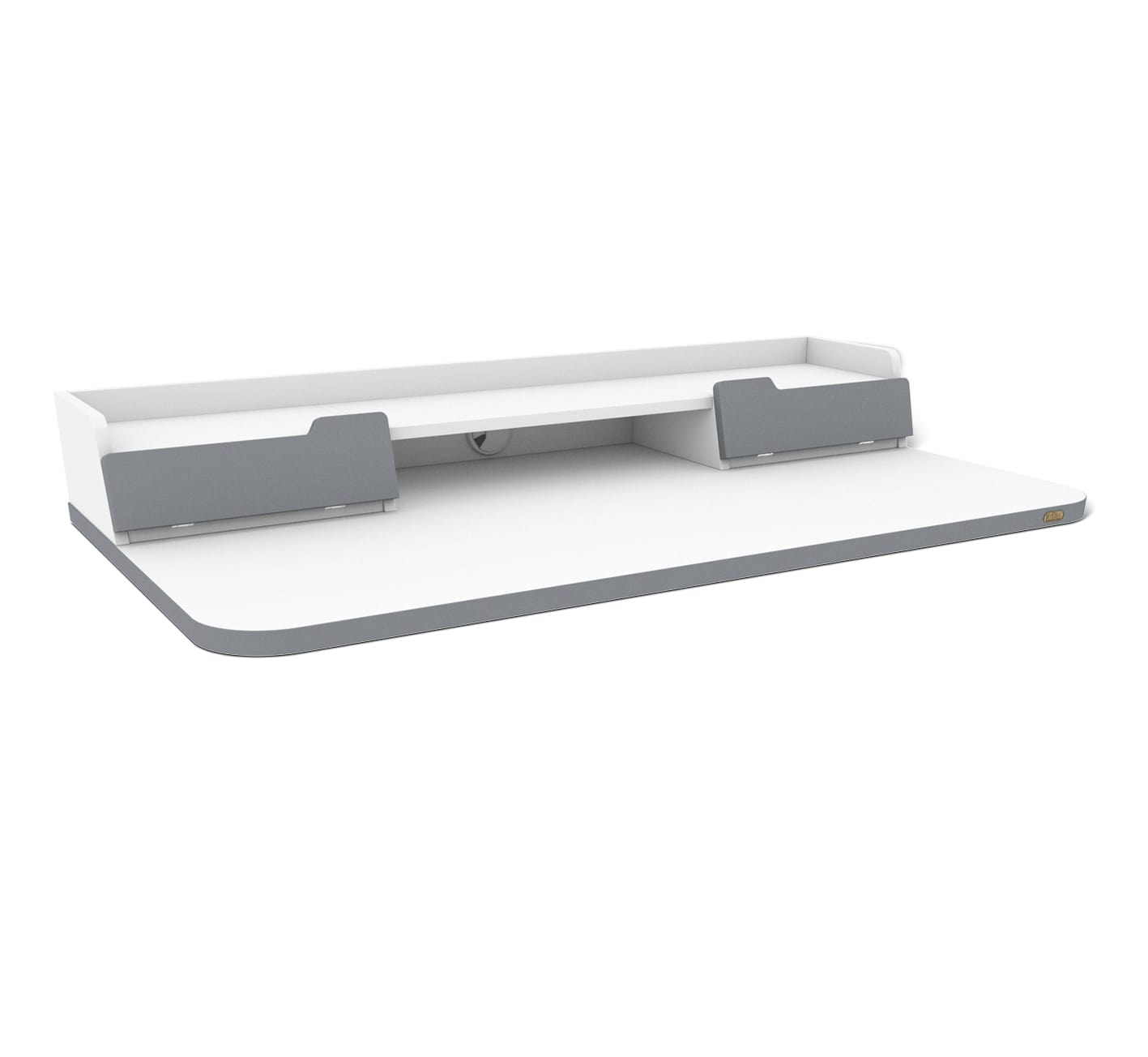 Сдержанный стиль столешницы идеально сочетается с мебелью в современном стиле. На рабочей поверхности расположены два вместительных выдвижных ящика высотой 165 мм и шириной 318 мм для хранения разных вещей. Удобная ниша между ящиками на столешнице подходит для ноутбука. Столешница оборудована системой кабель-менеджмента. В заднем бортике имеется отверстие для проводов, что позволяет удобно расположить зарядку для ноутбука или технические кабели компьютера.