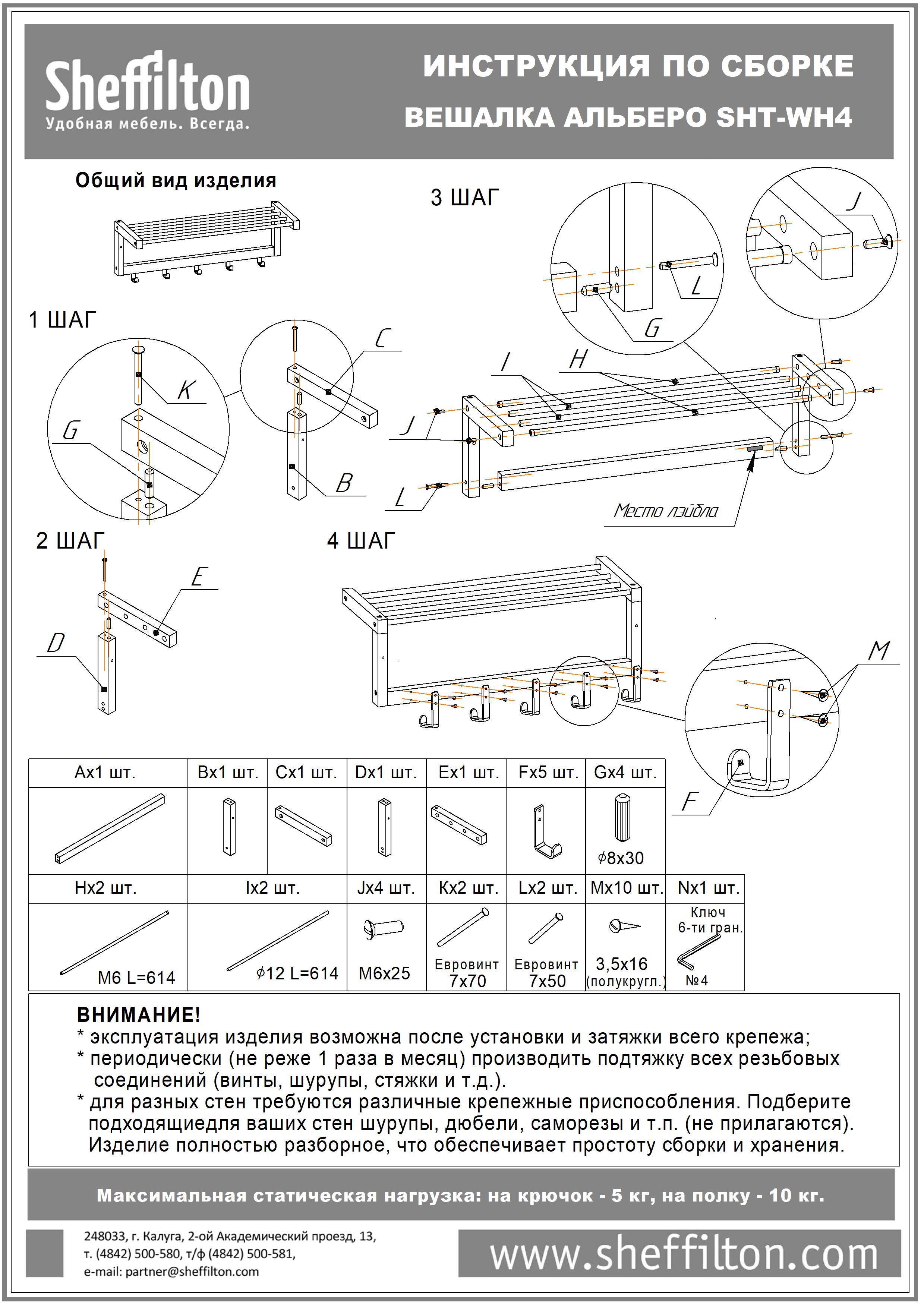 Максимальная распределенная статическая нагрузка на крючок - 5 кг, на полку - 10 кг.