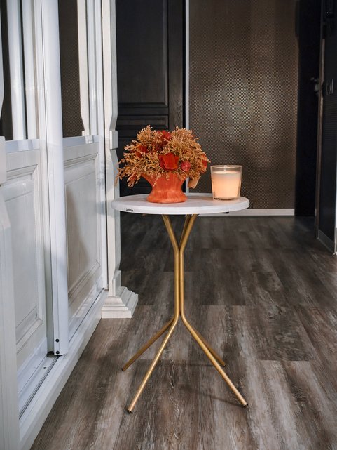 В качестве дизайнерского хода основание столика покрашено в благородный золотой цвет. Столешница из МДФ смотрится аккуратно и привлекательно, поскольку имеет плавный закругленный переход от лицевой поверхности к боковым кромкам. Рисунок под натуральный мрамор добавит нотку естественности.
