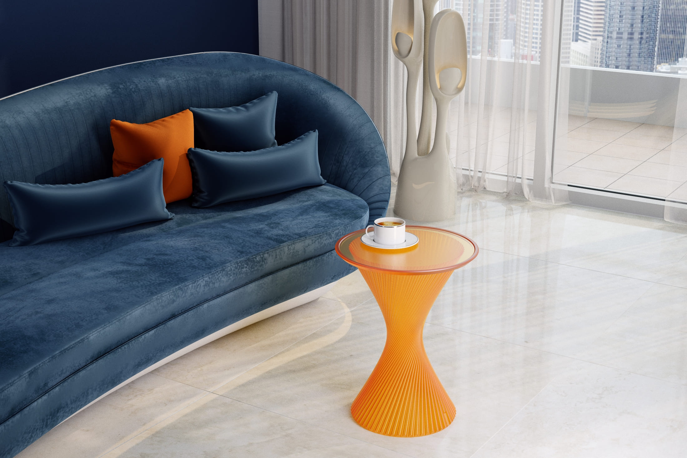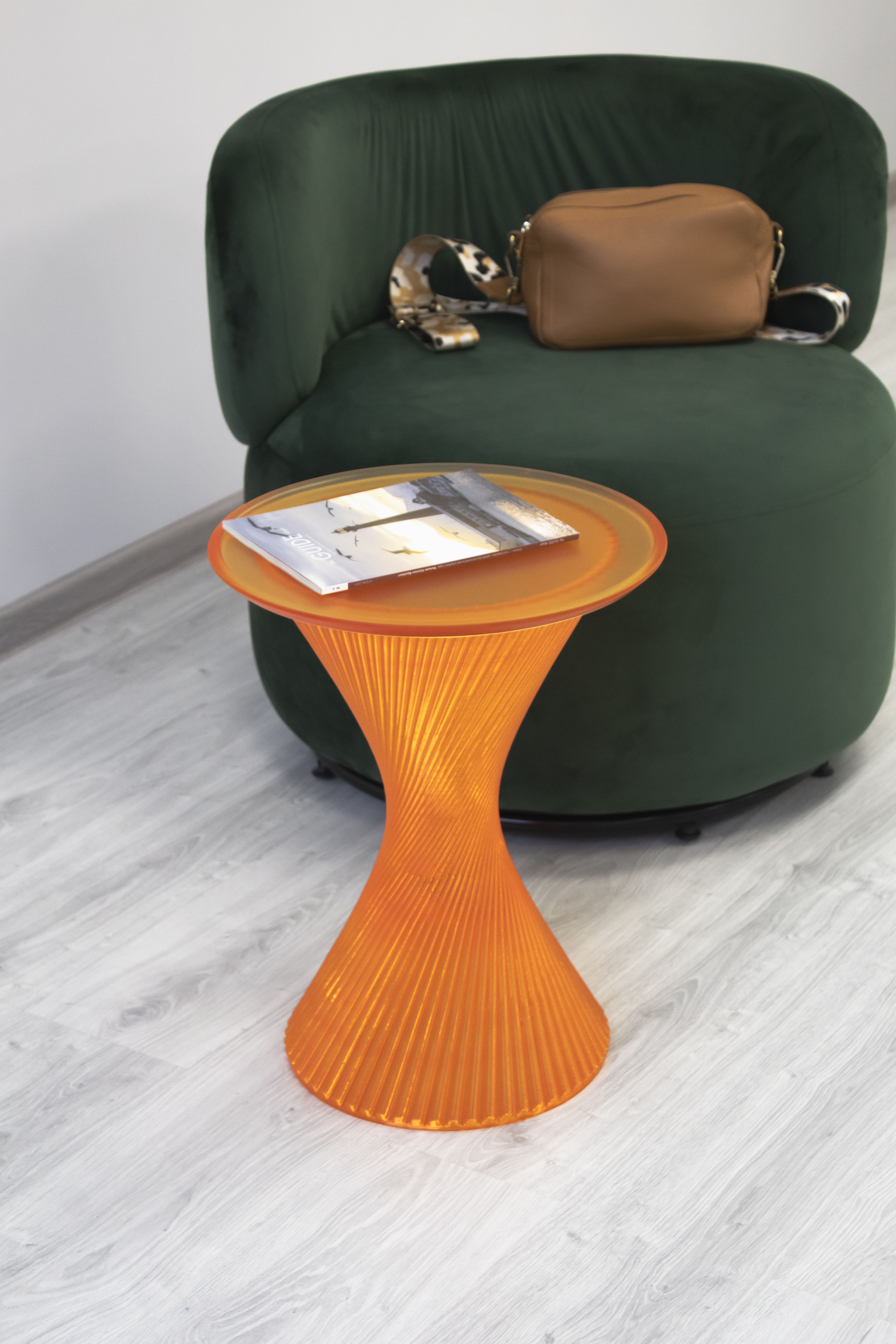 Благодаря использованию стекловидного материала, лучи проходящего света создают необыкновенную игру бликов, и делают столик визуально лёгким, не перегружая пространство.