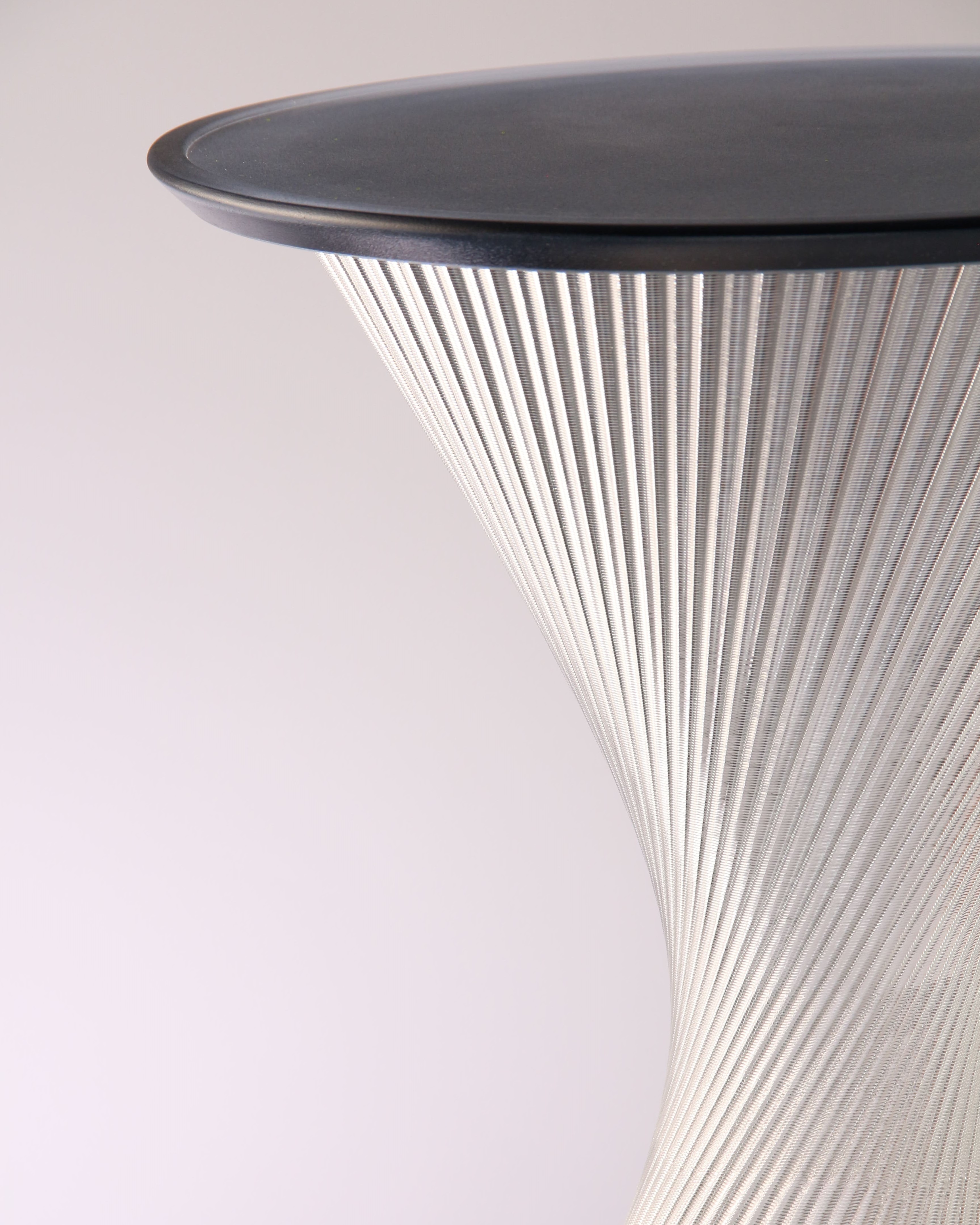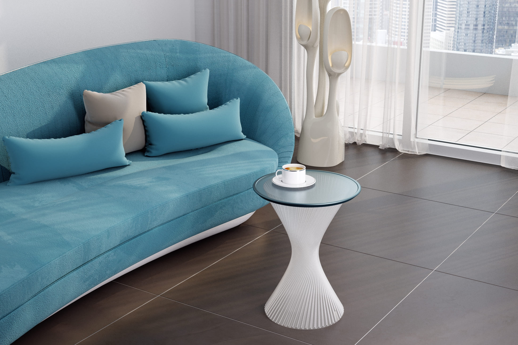 Благодаря использованию стекловидного материала, лучи проходящего света создают необыкновенную игру бликов, и делают столик визуально лёгким, не перегружая пространство.