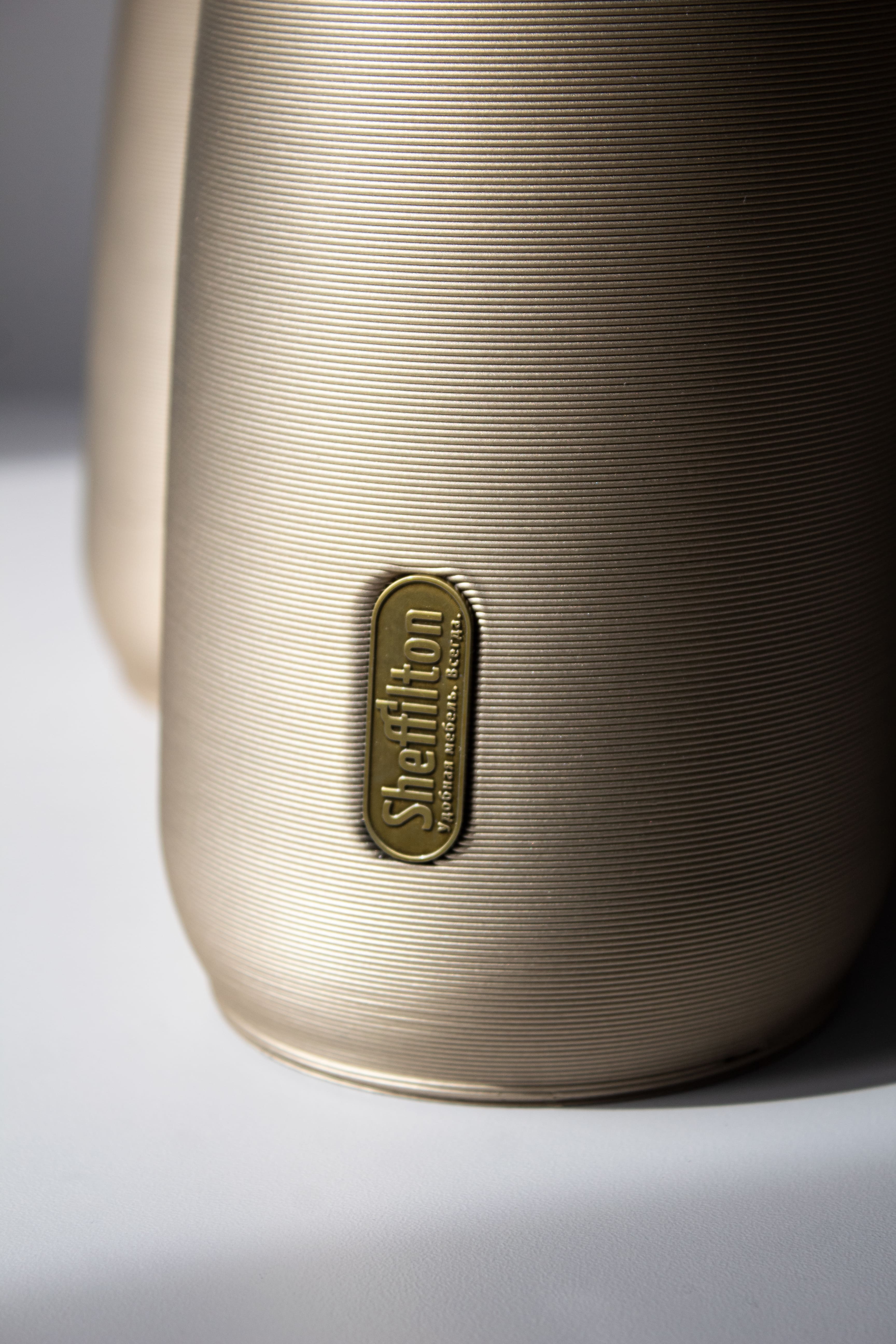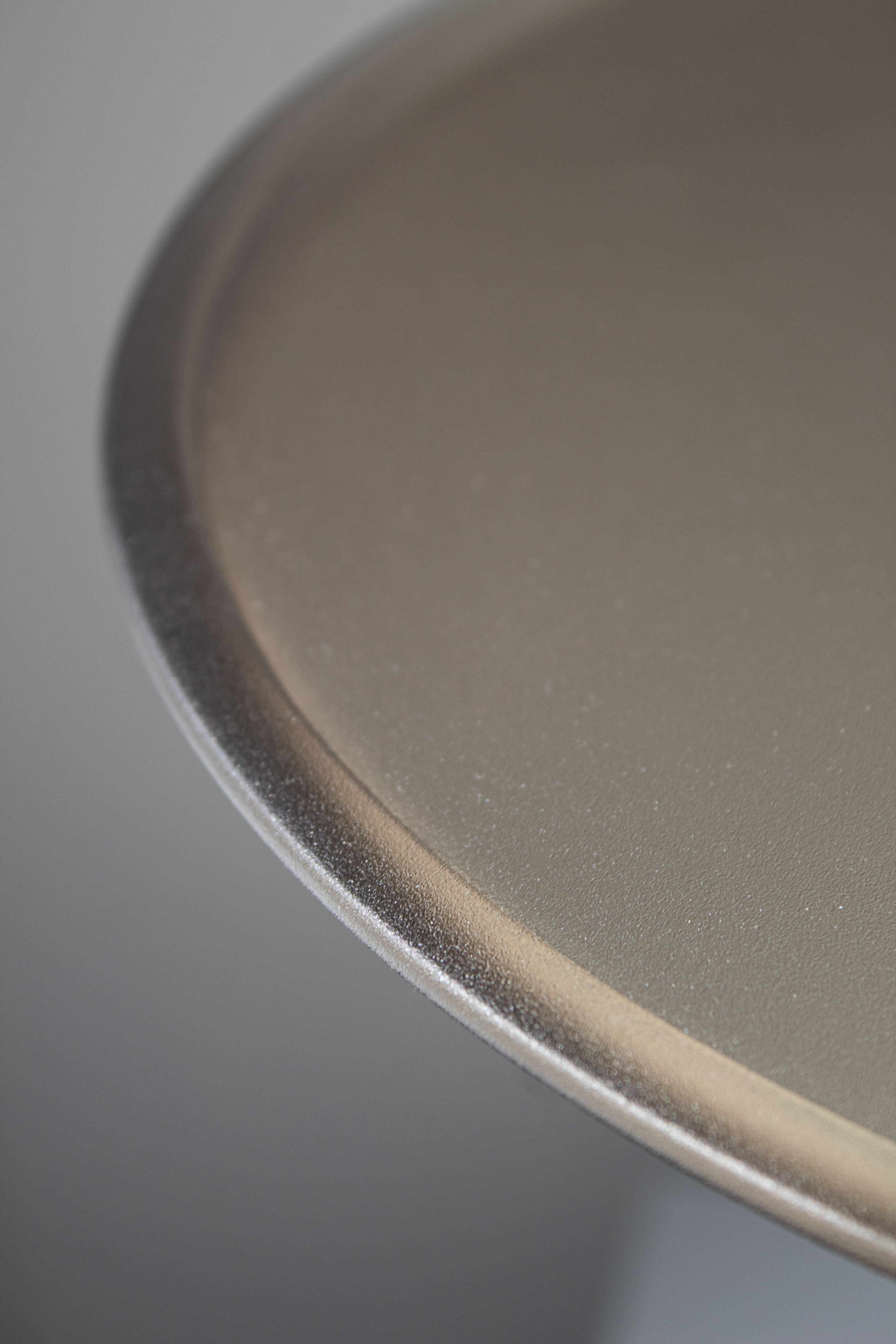 Специальная покраска создает иллюзию металла на солнце, а полупрозрачная столешница подчеркивает игру света и архитектурность форм.